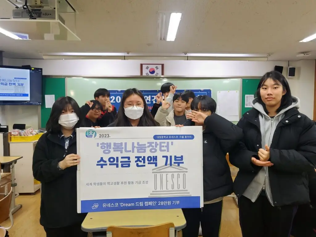 대청중학교에서는 하늘빛 축전 행사 시 유네스코 동아리에서 ‘행복나눔장터’를 운영하여, 그 수익금을 유네스코한국위원회에 기부해주셨습니다.