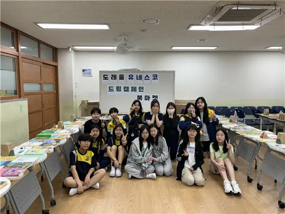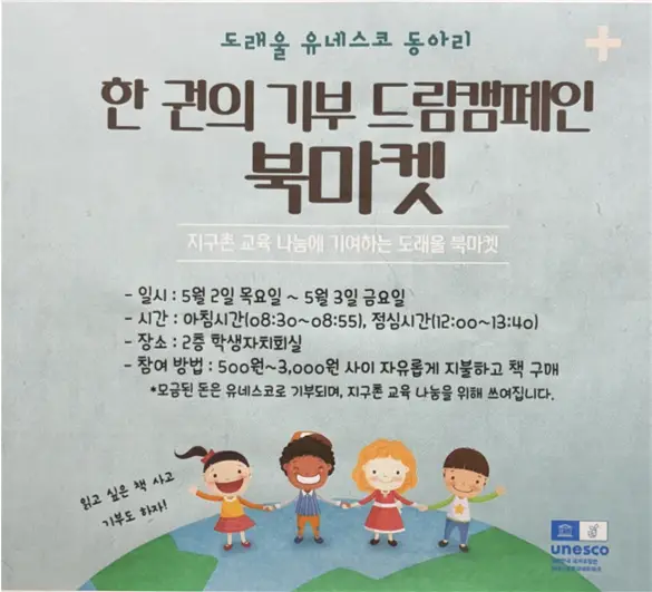 | 활동내용 | 학교 학생들과 교직원들이 기부한 책으로 북마켓을 열었습니다. 유네스코 동아리 학생들이 약 2주 동안 지구촌 교육 나눔과 세계 책과 저작권의 날과 관련한 캠페인의 의의를 홍보하였고, 200권 가량의 책을 기부받았습니다. 기부 받은 책으로 ‘한 권의 기부 도래울 북마켓’을 열었고, 학생들과 교직원이 내고 싶은 만큼 자유롭게 책의 가격을 책정하여 구매하는 방식으로 운영하여 총 132,550원의 금액이 모금되었습니다. |