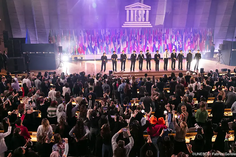 세븐틴은 연설에 이어 음악 무대로 유네스코 메인홀을 환하게 밝혔다. 이들은 ‘_WORLD’, ‘Darl+ing (ENG ver)’, ‘Headliner’, ‘음악의 신’, ‘같이 가요(ENG ver)’까지 총 5곡을 열창했다. 팀 특유의 자유분방하고 경쾌한 에너지가 돋보인 무대였다. 세븐틴은 밝고 감성적인 멜로디를 오가며 아티스트로서의 감동을 강렬하게 전했다.