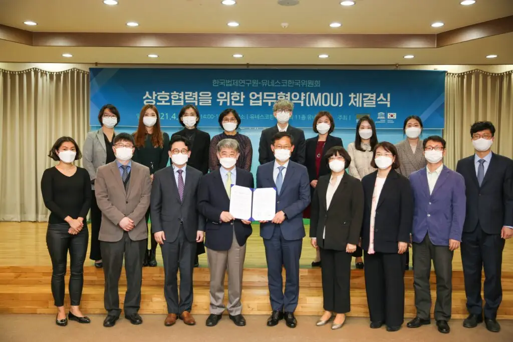 유네스코한국위원회(사무총장 한경구)와 한국법제연구원(원장 김계홍)은 4월 16일(금) 오후 2시 서울 명동 유네스코회관에서 업무협약식을 체결했습니다.