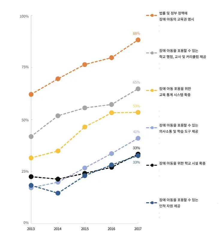 한편으로 점점 더 많은 국가들이 장애인의 교육 접근성을 높이기 위해 애를 쓰고 있다는 것은 분명해 보인다. 특히 법과 정책의 측면에서 각국의 노력이 두드러진다. 보고서에 따르면 현재 193개 유엔 회원국 중 34개국은 헌법에 장애인의 교육권 또는 장애로 인한 교육 차별을 금지하는 조항을 명시해 두고 있다. 또한 <그림 2>에서 볼 수 있듯, 2013년부터 2017년 사이 전 세계 87개~101개 조사 대상 국가 중 장애인의 교육권을 법률이나 정책에 반영해 둔 국가의 비율도 2013년 62퍼센트에서 2017년에는 88퍼센트까지 높아졌다. 적어도 법과 제도에서만큼은 각국이 지난 5년간 장애인의 교육권을 높이는 데 의미 있는 진전을 이뤄냈다는 뜻이다.