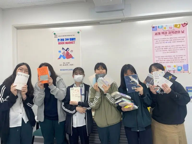 | 활동내용 | 4월 10일부터 5월 3일까지 한 권의 기부 활동 캠페인 홍보를 통해 책을 기부 받고, 5월 9일, 10일 점심 시간 동안 도서관에서 책을 판매하는 활동을 하였습니다. 200권 이상의 책을 판매하였습니다. 책을 기부하거나 구매한 학생에게는 북마크를 선물로 증정하였습니다. 판매를 통한 수익금은 유네스코에 기부하였습니다. |