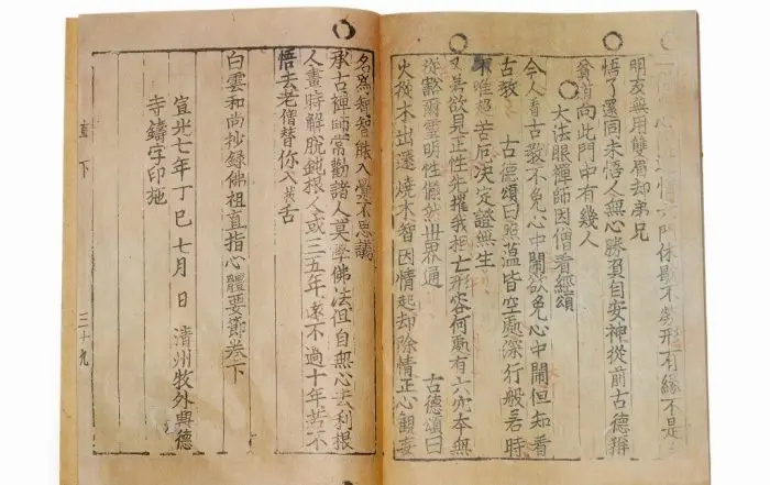 ≪불조직지심체요절≫은 고려 말에 백운화상(1299-1374)이 엮은 불교 서적으로 ≪직지심체요절≫, ≪직지≫라고도 합니다. 참선을 통하여 깨달음을 얻을 것을 주창한 선불교의 내용을 담고 있는데요, 여러 경전과 법문에 실린 부처와 고승의 가르침 중에서 좋은 구절만 뽑아 편찬해 ‘승려들의 교과서’라 불릴 정도지요. ≪직지≫는 현존하는 세계에서 가장 오래된 금속활자본(금속활자로 찍어 낸 책)으로서 인류의 인쇄 역사상 매우 중요한 기술적 변화를 보여 주고 있습니다. ≪직지≫의 발문(책의 끝에 간행 경위 등을 적은 글)에는 “청주 흥덕사에서 1377년 7월 금속활자로 인쇄되었다.”고 명확히 기록되어 있지요. 당시 ≪직지≫는 상·하 2권으로 만들어졌는데요, 상권은 아직까지 발견되지 않았습니다. 세계기록유산에 등재된 것은 하권으로, 현재 우리나라가 아니라 프랑스 국립도서관에 소장되어 있습니다.