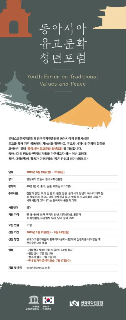 유네스코한국위원회와 한국국학진흥원은 동아시아의 전통사상인 유교와 세계시민주의의 접점을 모색하기 위해 ‘동아시아 유교문화 청년포럼’을 개최합니다. 동아시아 공동체의 가능성을 확인하고, 지역의 평화와 번영의 기틀을 마련하고자 하는 이번 포럼에 청년, 대학(원)생, 활동가 여러분들의 많은 관심과 참여 바랍니다.