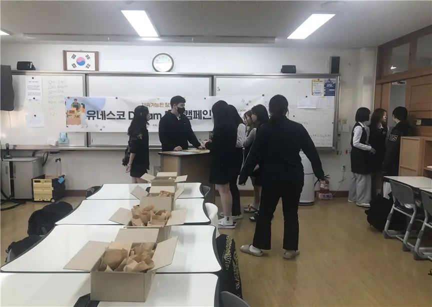 | 활동 내용 | <지속가능한 소비를 위한 플리마켓: 2025년 7월 7 일 ~ 2025년 7월 16일> 1단계 개념 알아보기 ‘Meaningful Youth Engagement(의미 있는 청소년 참여)’의 개념을 배우고 청소년이 사회 변화에 참여할 수 있는 방법을 탐구 2단계 문제 알아보기 패스트 패션의 환경적·사회적 문제를 조사하고, 지속가능한 소비의 필요성 인식 3단계 포스터 제작 및 발표 패스트 패션의 문제점을 알리는 영어 포스터를 제작하고 친구들 앞에서 영어로 발표 4단계 플리마켓 준비 및 운영 입지 않는 옷을 모아 플리마켓을 준비하고, 판매를 통해 지속가능한 소비 실천 5단계 나눔과 성찰 플리마켓 수익금을 유네스코에 기부하고, 구매 인증샷과 소감을 패들릿에 공유하며 활동을 마무리 <지속가능한 창의 마켓: 2025년 8월 20 일 ~ 2025년 10월 29일> 1단계 창의 마켓 작품 제작 학급별로 친환경 메이커 작품(플라워 센터피스, 다육이 화분, 양말목 도어벨, 친환경 천연 샴푸바, 인권 캘리그라피 전등, 폐CD를 활용한 시계. 냅킨 아트 연필꽂이)을 제작, 학생 1인은 2개의 작품을 완성하여 1개는 소장, 1개는 창의 마켓에 기증함. 2단계 학급 부스별 판매 각 학급에서 학생 주도로 부스별 메이커 작품을 판매하고 수익금은 유네스코 한국위원회에 기부 <지구촌 교육나눔 캠페인 유네스코 무비데이: 2025년 10월 1일 ~ 2025년 10월 29일> 1단계 유네스코 무비데이 기념품 판매 유네스코 무비데이 기념품(팝콘, 음료) 판매 후 수익금은 유네스코 한국위원회에 기부 2단계 다큐멘터리 시청 EBS 특집다큐 “AI 사피언스 시대: 당신은 진화하고 있습니까?” 시청 3단계 개별 보고서 작성 지구촌 교육 격차 문제를 조사하고 해결 방안을 찾는 개별 보고서 작성 4단계 개별 보고서 발표 학급에서 개별 보고서 발표 및 공유 |