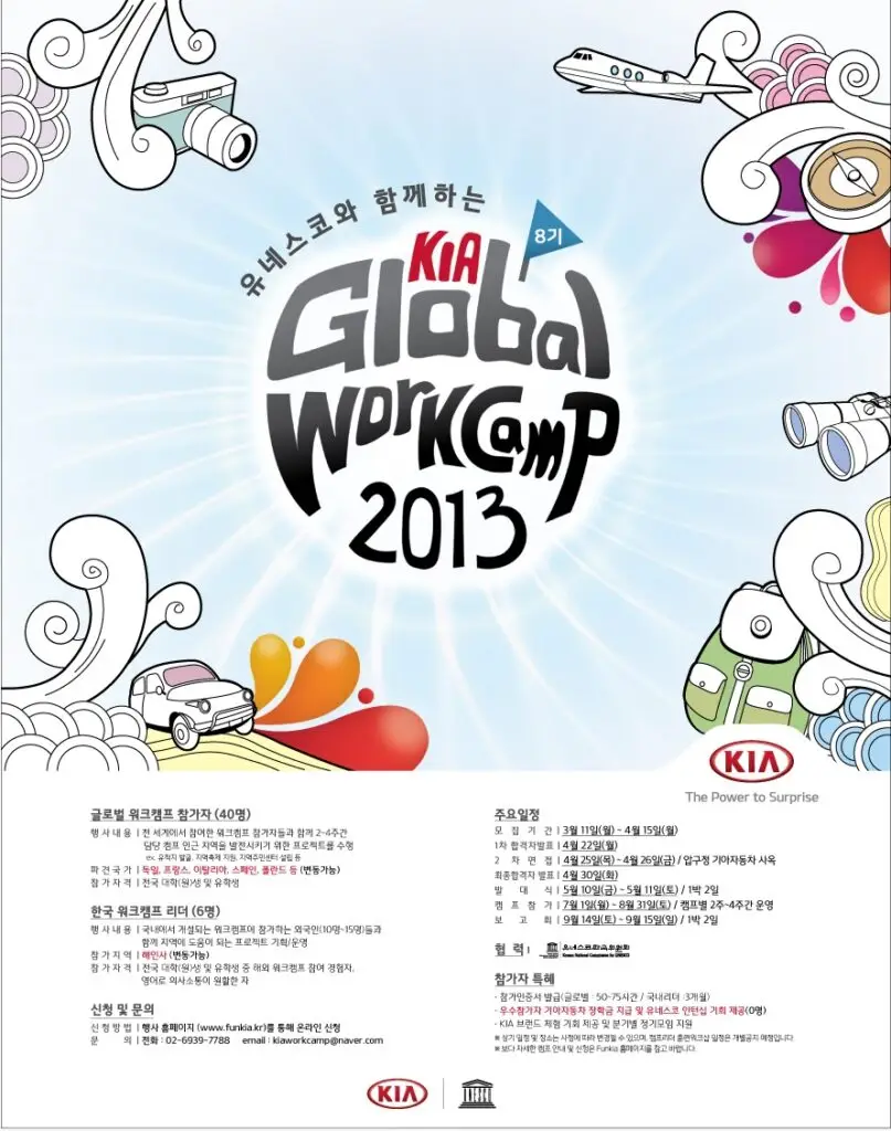 올해로 8기를 맞이하는 ‘유네스코와 함께하는 기아 글로벌 워크캠프 2013’이 3월 11일부터 4월 15일까지 글로벌 인재로 거듭날 청년·대학(원)생들을 모집한다.