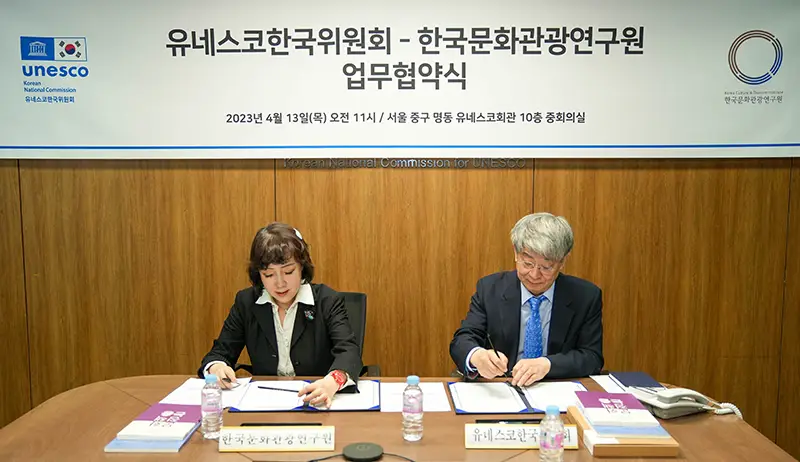유네스코한국위원회(한경구 사무총장)는 2023년 4월 13일(목) 유네스코한국위원회 10층 중회의실에서 한국문화관광연구원(김세원 원장)과 함께 문화 분야 지속가능한 발전과 대한민국 유네스코 활동 기여를 위한 업무 협약을 체결했다.