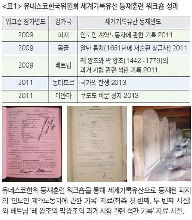 유네스코한국위원회의 경우 유적지 보존보다는 세계기록유산 등재훈련 워크숍을 통해 저개발국 현지전문가의 능력을 함양시키거나 등재를 지원하는 방식을 취하고 있다고 발표했다. 등재훈련 워크숍은 2009년 아태지역을 시작으로 2012년에는 아프리카에서 실시되었으며 워크숍 참가 대상은 아직 세계기록유산을 등재하지 못하였거나 한 건만 등재한 국가들로 구성된다. 워크숍을 통해 동티모르와 미얀마가 실제로 기록유산을 등재하는 성과(표 1 참조)도 있었으며, 금년에는 중앙아시아 지역을 대상으로 기록유산 워크숍을 개최하고 세계유산 등재지원 사업으로도 확대할 계획이다.