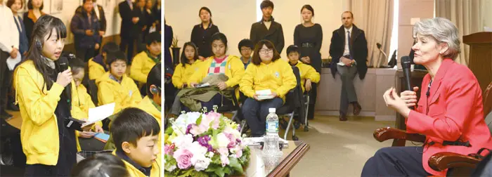 보코바 사무총장은 “유네스코와 한국은 서로 긴밀한 인연을 맺고 있습니다. 한국은 매우 훌륭한 파트너입니다. 그래서 저는 한국과 유네스코한국위원회에 대한 존중을 표시하고자 이곳에 왔습니다. 그리고 정말 훌륭한 여러분을 만나기 위해 이 곳에 왔습니다”라며 환한 얼굴로 유네스코 키즈를 반겼다. 이어 보코바 사무총장은 자신과의 만남이 파리 유네스코 본부가 아닌 서울 유네스코한국위원회에서 이뤄진 것에 대해 양해를 구했다. 유네스코 키즈 겨울캠프 참가 어린이들이 2월 17일 파리 유네스코 본부를 방문하기로 예정돼 있었기 때문.