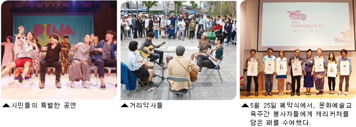 2011년 36회 유네스코 총회에서 세계문화예술교육 주간이 선포된 이후, 두 번째 해를 맞이한 이번 기념 행사에는 시민들이 직접 기획 · 운영에 참여한 프로그램들이 많아 눈길을 끌었다. ▲무용가 안은미와 무용을 전공하지 않은 일반 시민들이 펼친 ‘시민들의 특별한 공연_몸 SNS를 위한 전무후무’, ▲고등학교 남학생들의 인터뷰를 통한 사진 · 미디어 작품 ‘고함, 내 안에 소리치는 울림’, ▲아마추어 밴드 20팀의 음반 제작과 거리공연 ‘밴드의 리어카, 광화문을 굴리다’, ▲워크숍 박람회에서 예술꽃씨앗학교 어린이들이 보여준 플래시몹, ▲시장 상인들의 이야기를 작품으로 전시한 ‘황학동 별곡_100인의 이야기’ 등 시민들이 주체가 된 프로그램들로 채워진 <2013 세계문화예술교육 주간>이었다.