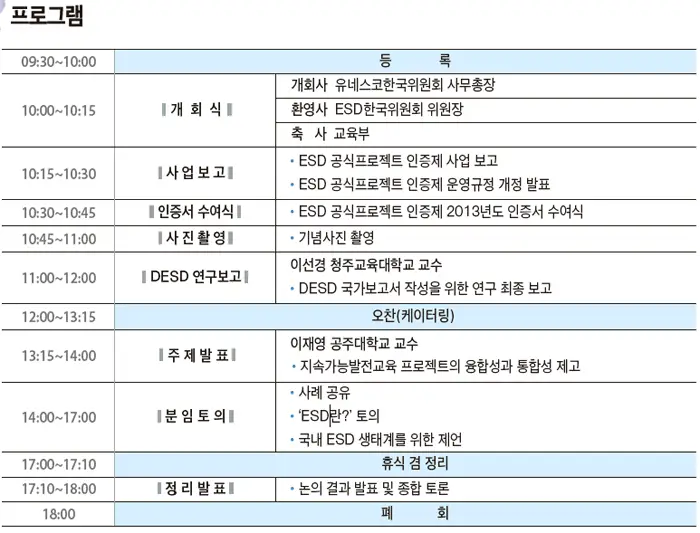 2014년 유엔지속가능발전교육10년(Decade of Education for Sustainable Development: DESD, 2005∼2014)의 종료를 앞두고, 유네스코 지속가능발전교육(ESD) 공식프로젝트 실행기관 및 단체를 비롯하여 국내 다양한 영역에서 ESD를 추진해온 여러 관계자들을 모시고, 경험 공유 및 향후 발전 방안 마련을 위한 한마당을 열고자 합니다.