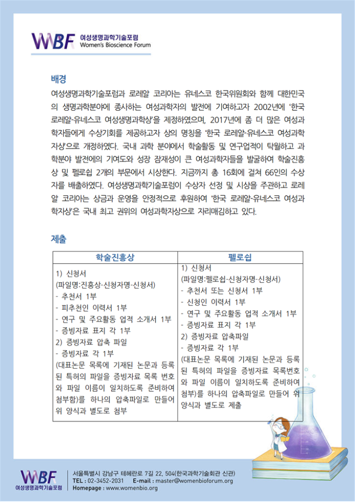 유네스코한국위원회, 로레알코리아, 여성생명과학기술포럼에서 주관하는 제17회 한국 로레알-유네스코 여성과학자상의 지원자를 아래와 같이 모집하오니, 관심 있는 분들의 지원 바랍니다.
