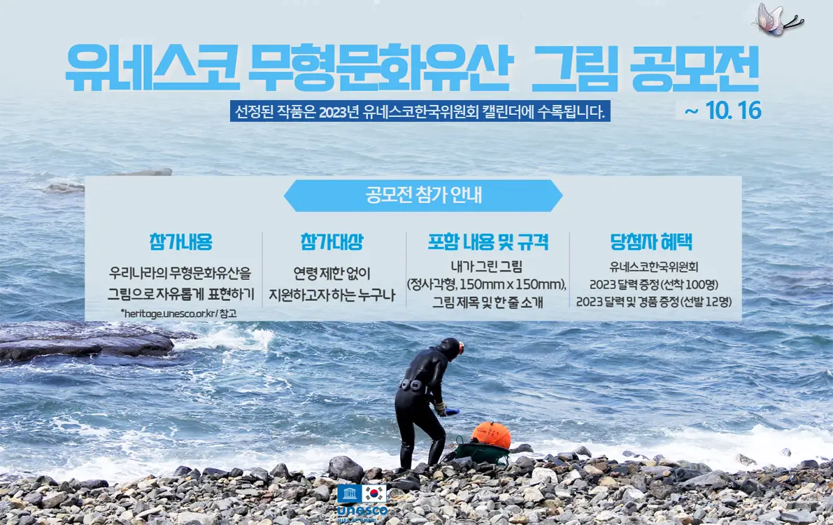 유네스코한국위원회는 2023년 달력 제작을 위한 “유네스코 한국 무형문화유산 그림 공모전”을 개최합니다. 2023년은 인류의 무형유산을 보호하기 위한 ‘무형문화유산 보호 협약’이 채택된 지 20주년이 되는 해로, 무형유산의 중요성에 대한 인식을 고취하기 위해 아래와 같이 그림 공모전을 개최하오니, 관심있는 분들의 많은 참가 바랍니다.