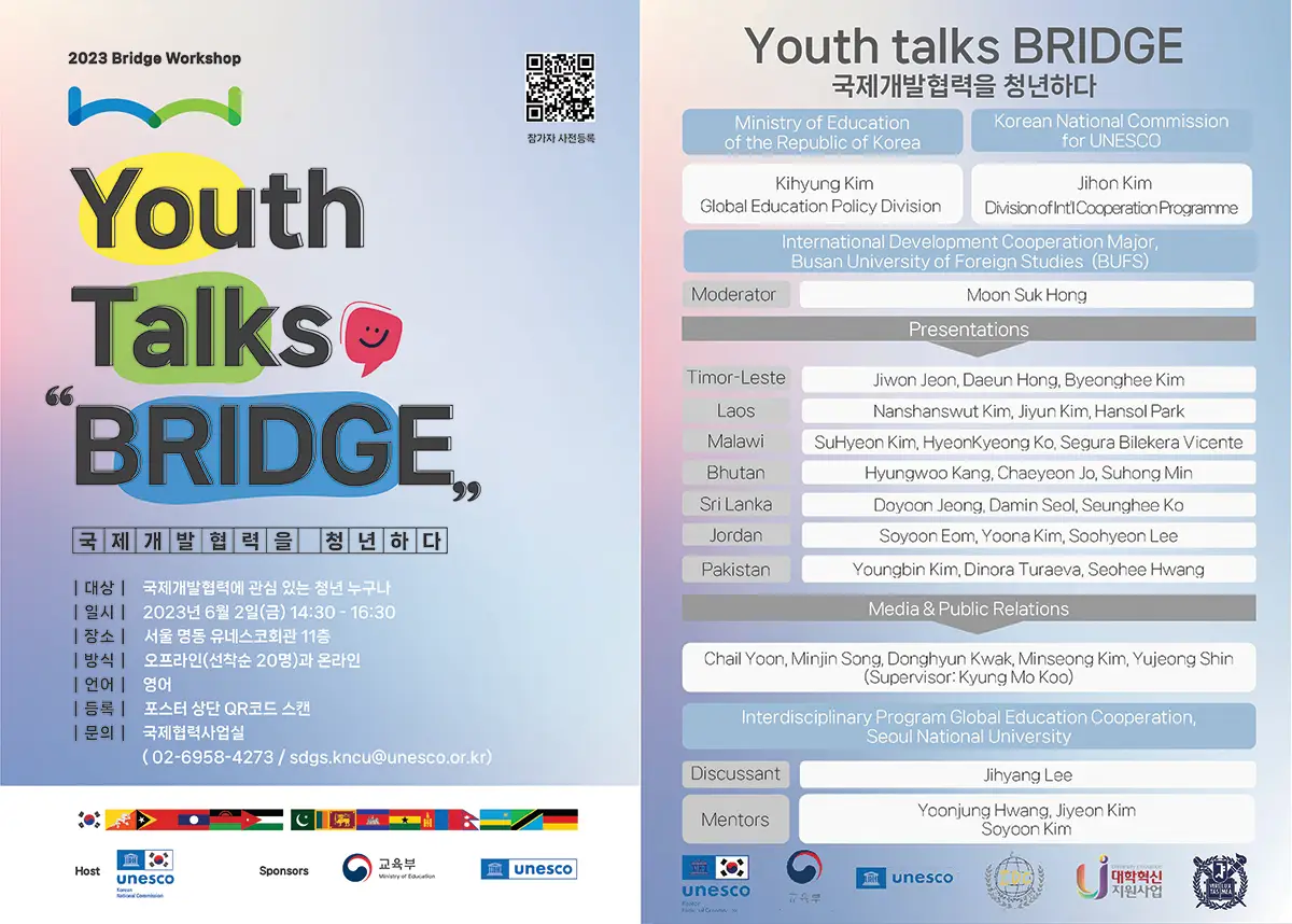 유네스코한국위원회는 국제개발협력에 관심있는 청년들을 위해 6월 2일(금) 오후 2시 30분부터 2시간 동안 유네스코 회관 11층에서 ‘국제개발협력을 청년하다: Youth Talks BRIDGE’를 개최합니다. 이 행사는 유네스코한국위원회가 교육부 및 유네스코의 후원으로 5월 31일(수)부터 6월 2일(금)까지 개최하는 ‘2023 브릿지 워크숍’의 마지막 행사로, 유네스코한국위원회의 개도국 기초 문해교육 및 직업훈련교육 지원 사업인 브릿지 사업의 7개국 현장의 유네스코 국가위원회와 협력기관 관계자들과 우리 청년과의 대화의 장으로 마련되었습니다.