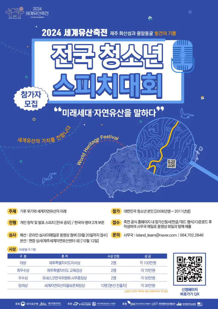 2024 세계유산축전 ‘제주 화산섬과 용암동굴’의 전국 청소년 스피치 대회 프로그램 ‘미래세대 자연유산을 말하다’를 다음과 같이 개최하니 많은 분들의 관심과 참여를 바랍니다. 상세한 내용은 포스터 이미지를 참고해주십시오.