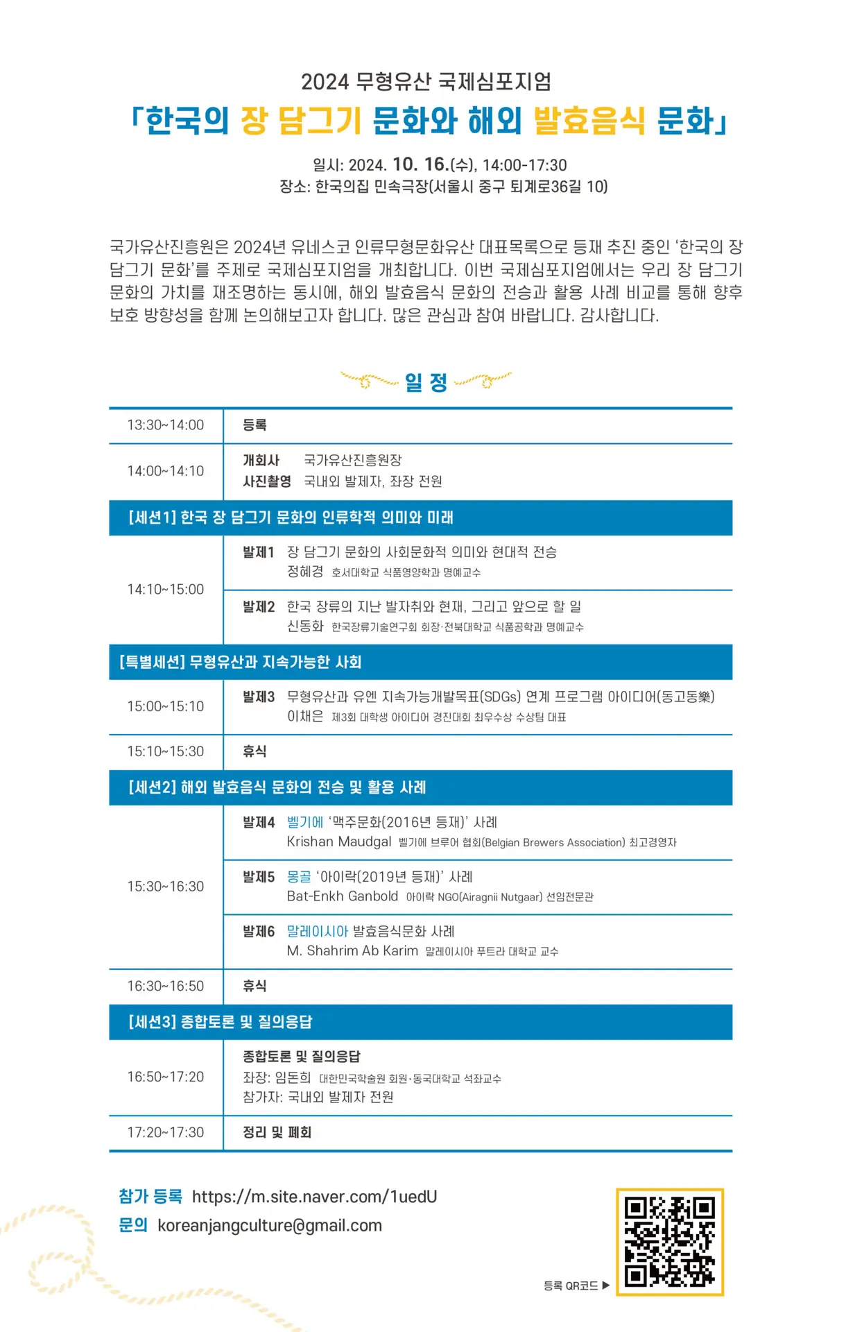 「한국의 장 담그기 문화와 해외 발효음식 문화」 - 일 시: 2024년 10월 16일(수), 14:00~17:30