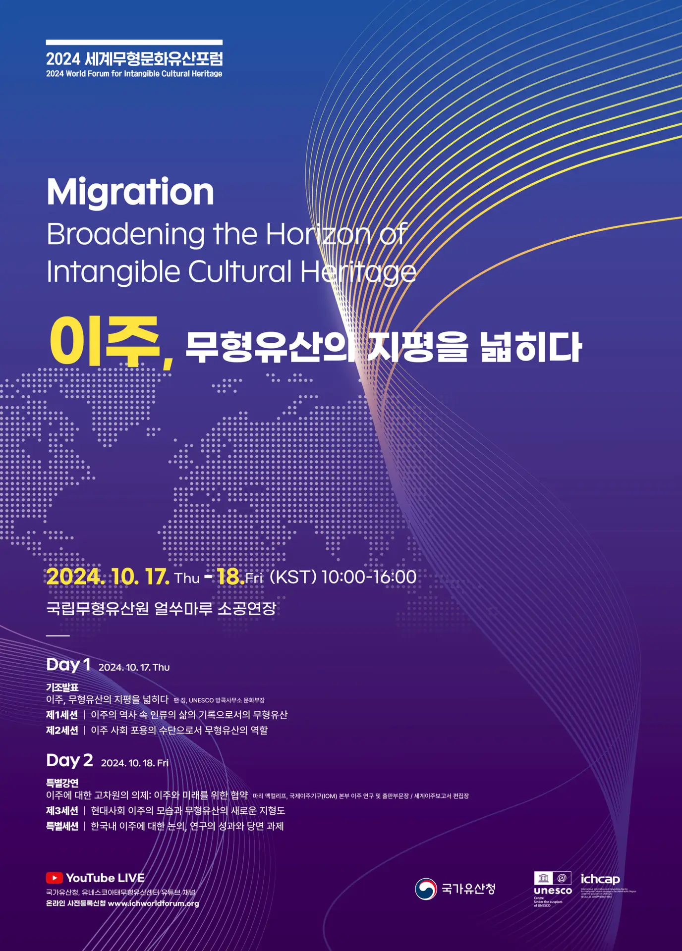국가유산청이 주최하고 유네스코아태무형유산센터가 주관하는 「2024 세계무형문화유산포럼」이 오는 10월 17일(목)부터 18일(금)까지 양일간 개최될 예정입니다. 많은 관심과 참석을 부탁드립니다.
