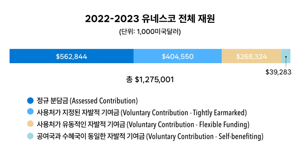 - 그중 각 회원국이 의무적으로 내야 하는 분담금(Assessed Contribution)은 약 5억 3464만 달러로 전체의 약 42%를 차지해요. 나머지는 분담금 외에 회원국이 내놓거나 외부에서 들어오는 자발적 기여금(Voluntary Contribution)이에요.