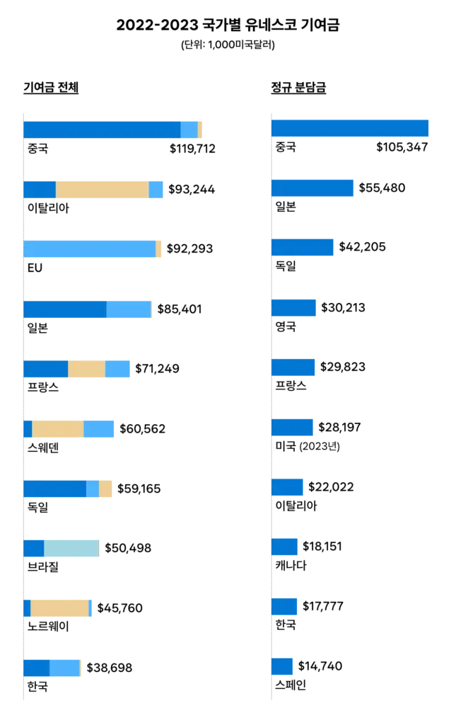 - 지난 2년간 중국에 이어 이탈리아, EU(EU 차원에서 낸 자발적 기여금 총액), 일본, 프랑스가 뒤를 이었고, 한국은 약 3869만 달러로 열 번째 자리를 차지했어요. 자발적 기여금을 뺀 분담금 순위로만 보면 중국-일본-독일-영국 순이고, 한국은 전체 회원국 중 아홉 번째로 많은 정규 분담금을 냈어요. 2022년까지는 8위였는데, 미국이 복귀하며 밀린 분담금 일부를 내면서 작년 말 기준으로 6위에 자리했기 때문이에요.