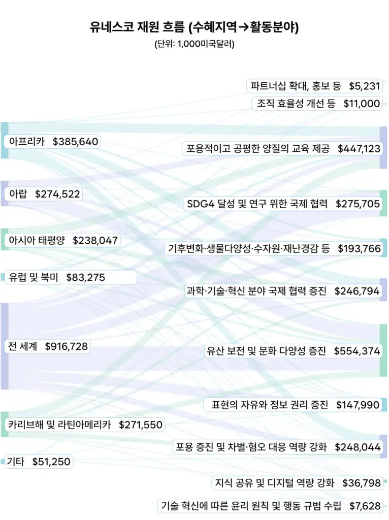 - 여기서 유입된 자금이 투입되는 대상을 지역별로 나눠보면 역시 전 세계를 대상으로 하는 프로그램에 투입되는 예산이 제일 많고(약 9억 1672만 달러), 지역별로는 아프리카(3억 8564만 달러), 아랍(2억 7452만 달러), 카리브해·라틴아메리카(2억 7155만 달러), 아시아태평양(2억 3804만 달러), 유럽·북미(8327만 달러) 순으로 많은 예산이 지출되고 있어요. 아무래도 개발도상국 이하 경제적으로 어려운 국가들에 유네스코가 신경을 많이 쓰는 것을 알 수 있죠.