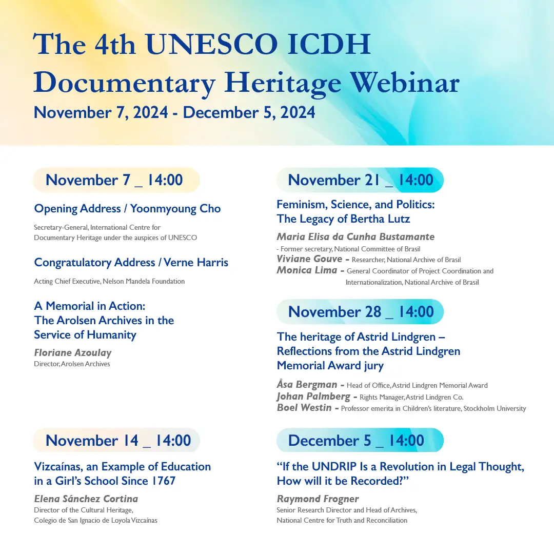 유네스코 국제기록유산센터는 기록유산에 대한 대중적 인식을 높이기 위한 노력의 일환으로 아래와 같이 제4차 ICDH 기록유산 웨비나를 개최합니다. 관심 있는 분들의 많은 참여와 관심 부탁드립니다.