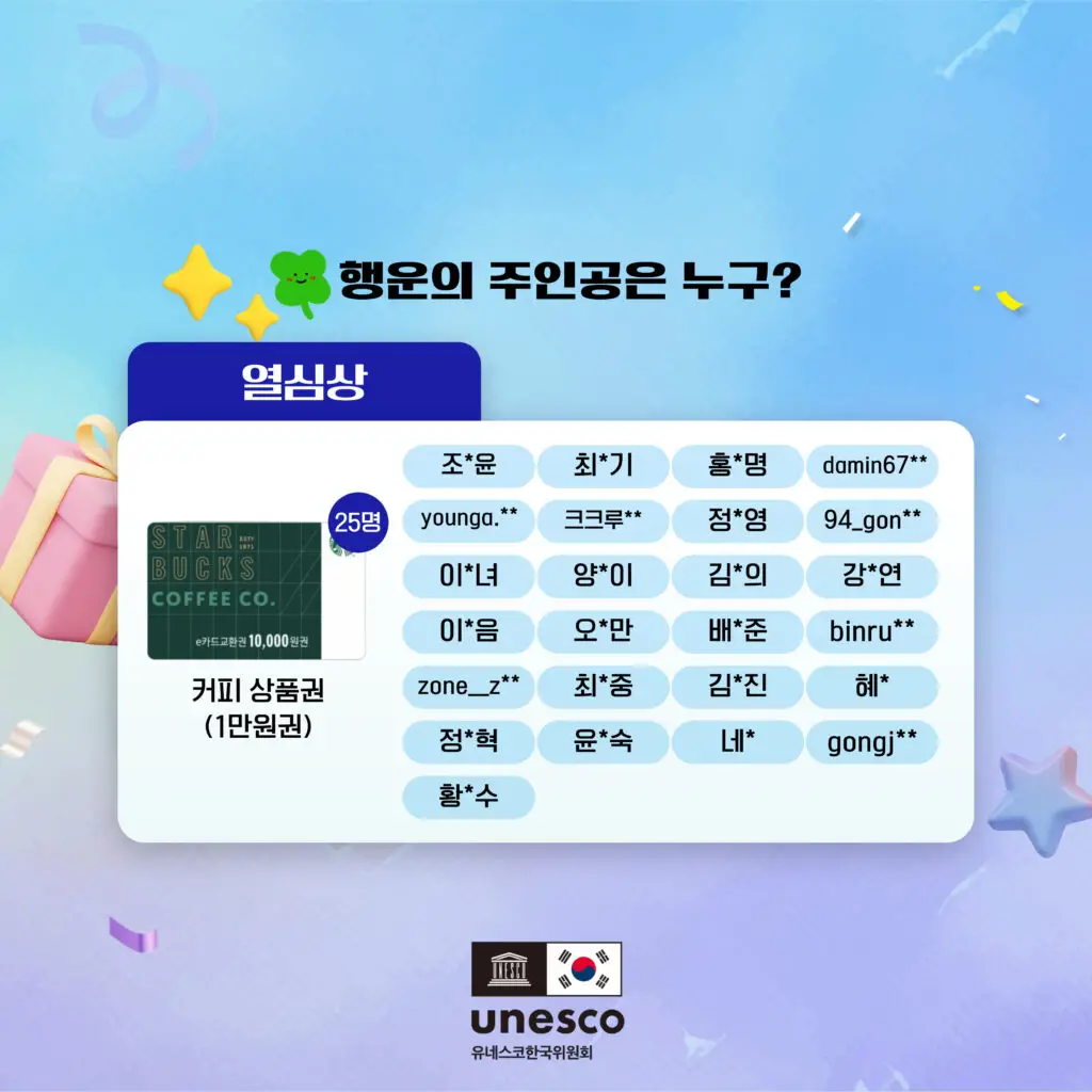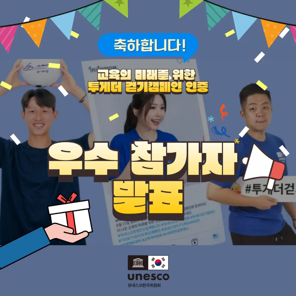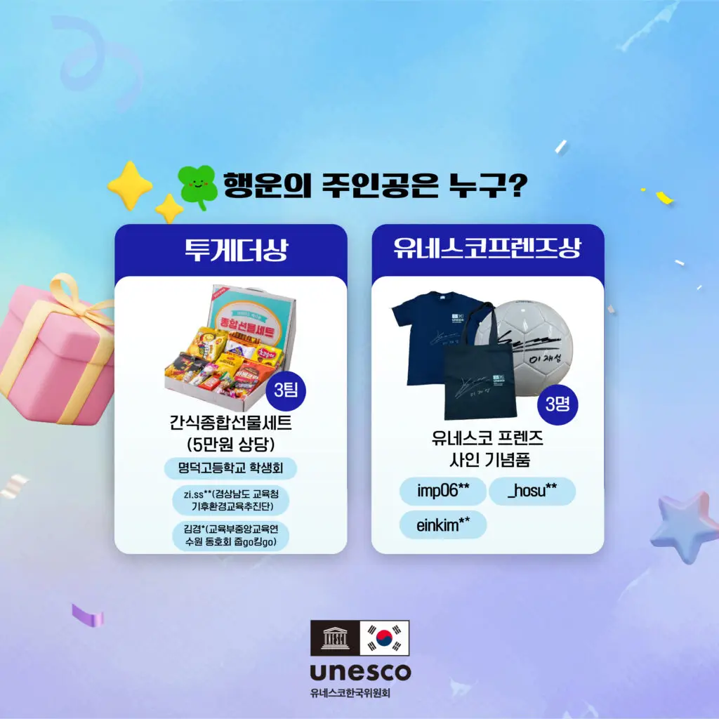 이번 캠페인을 통해 얻은 소중한 경험과 추억들이 여러분의 일상 속에서 작은 변화로 이어지기를 바라며, 유네스코한국위원회는 계속해서 더 나은 미래를 만들기 위해 힘쓰겠습니다! 여러분의 많은 관심과 참여 부탁드립니다. “함께”해요!