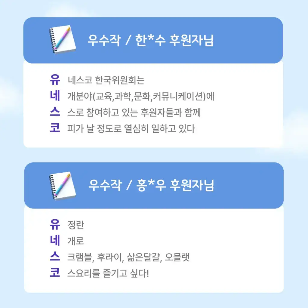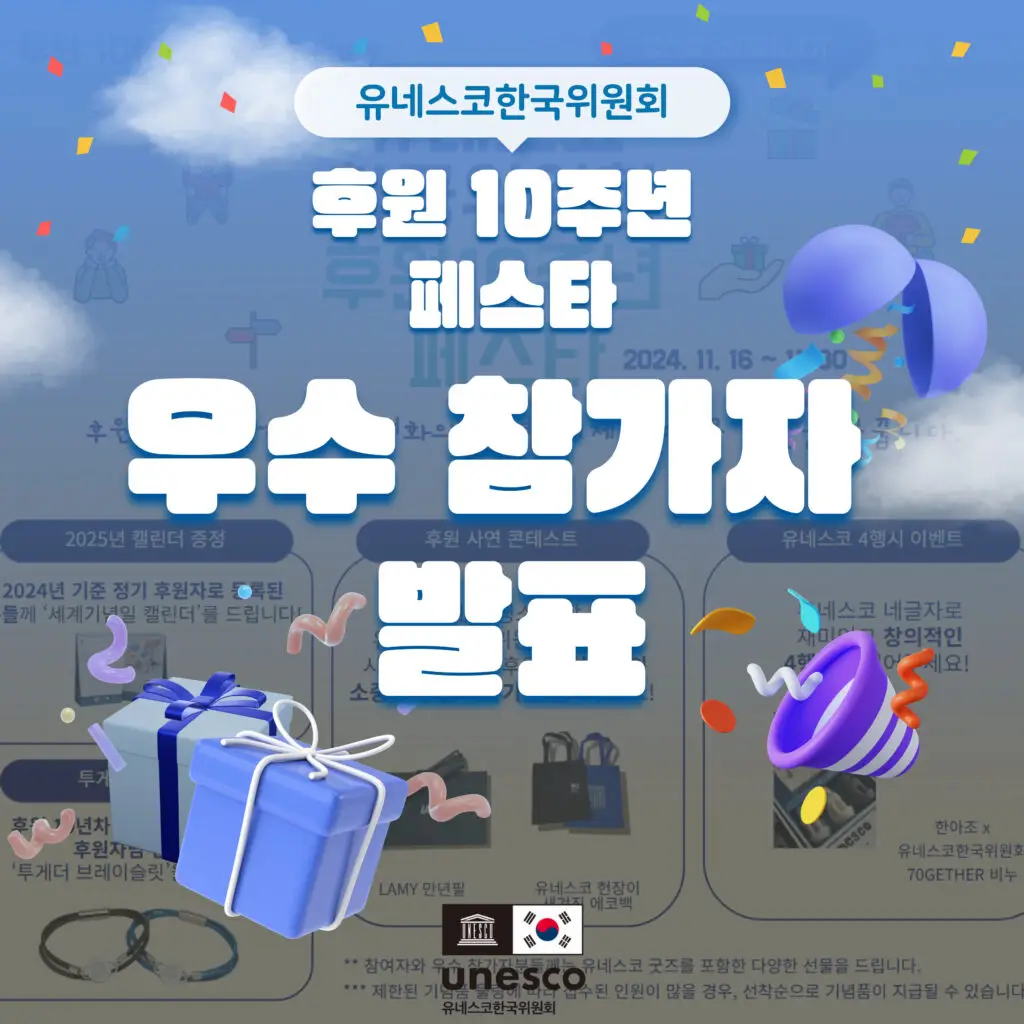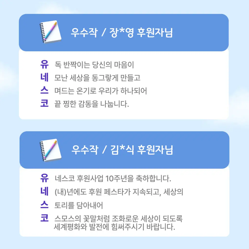 유네스코한국위원회 후원 페스타 행사에 많은 관심과 성원을 보내주신 후원자님들께 진심으로 감사드립니다. 이번 행사는 유네스코한국위원회 후원모금 10주년을 기념하며, 후원자님들께 감사의 마음을 전하고자 기획되었습니다. 후원자님들의 재치 넘치는 4행시와 가슴 따뜻한 후원 사연을 통해 많은 감동과 즐거움을 나눌 수 있었던 뜻깊은 시간이었습니다. ✨