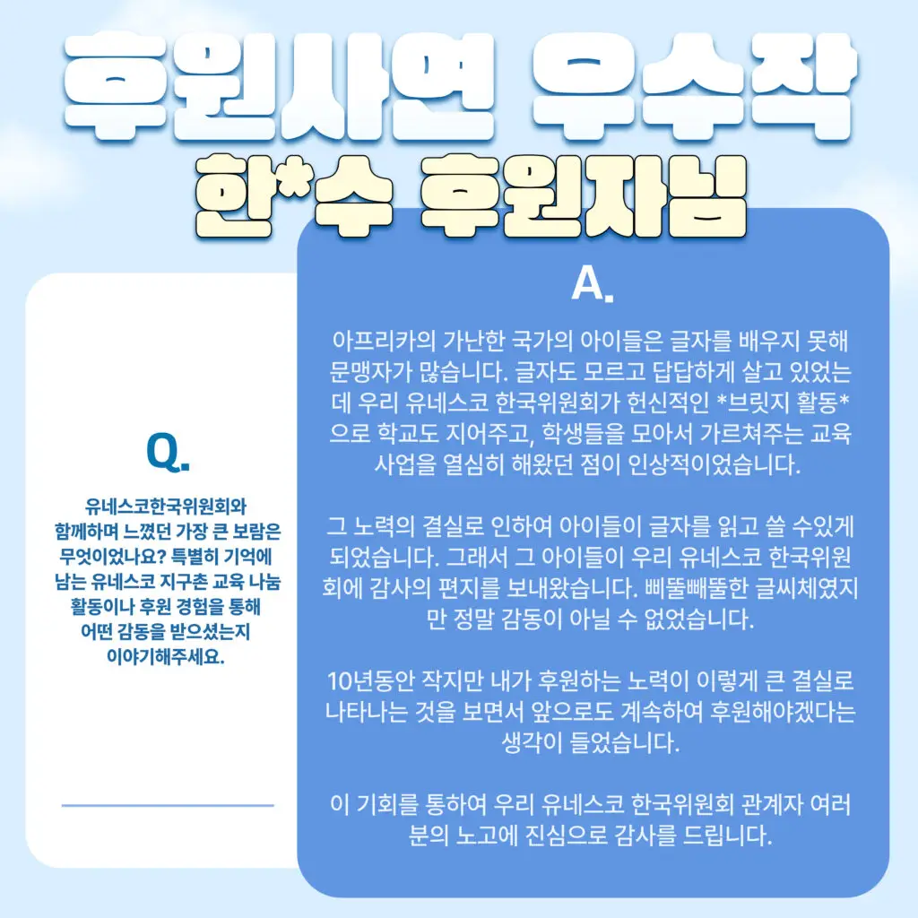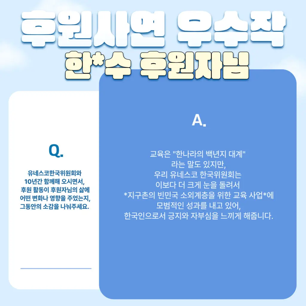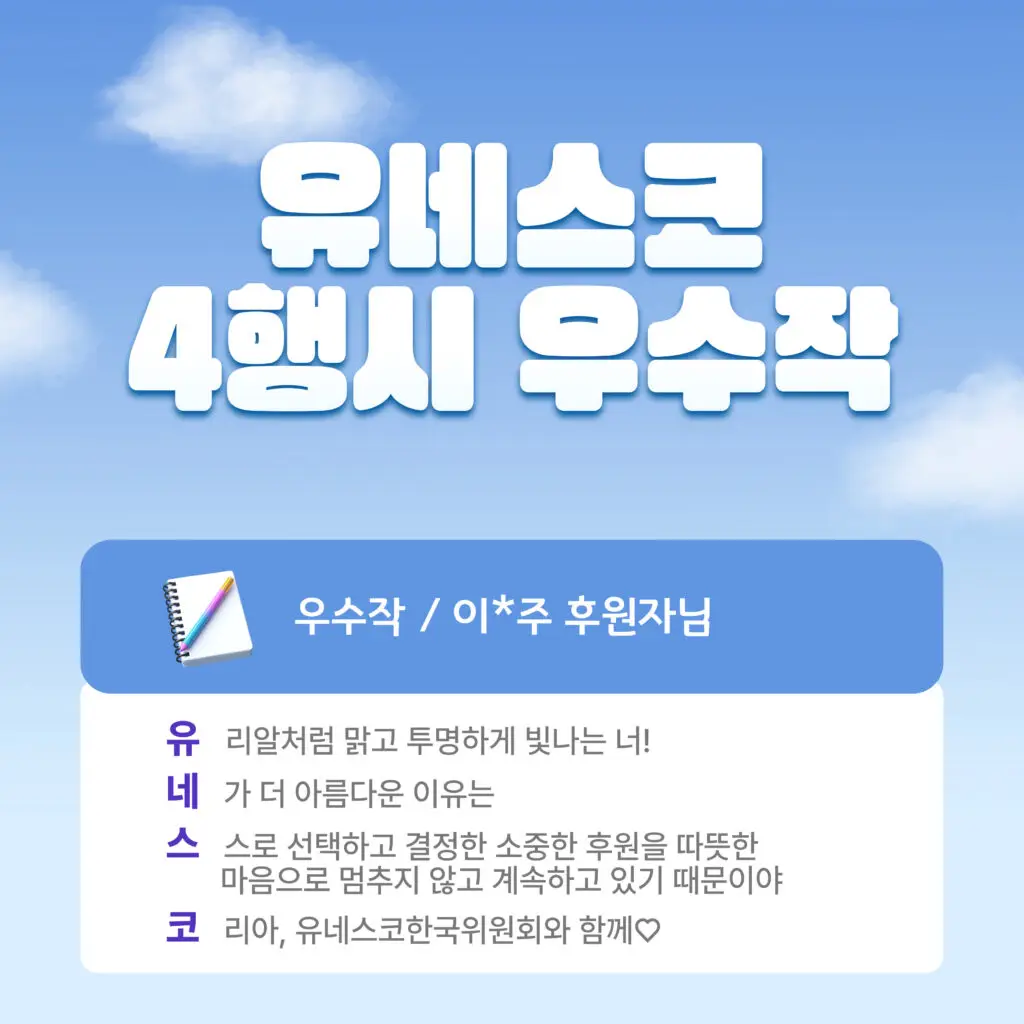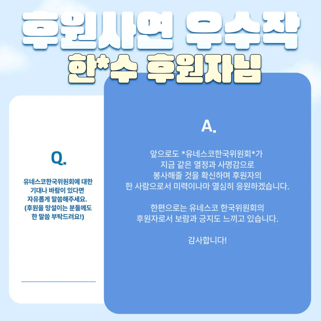 유네스코한국위원회를 향한 후원자님들의 따뜻한 관심과 지지에 다시 한번 깊이 감사드리며, 앞으로도 더 나은 미래를 위해 후원자님들과 함께할 수 있는 다양한 활동을 이어가겠습니다. 앞으로도 많은 관심과 참여 부탁드립니다. ?