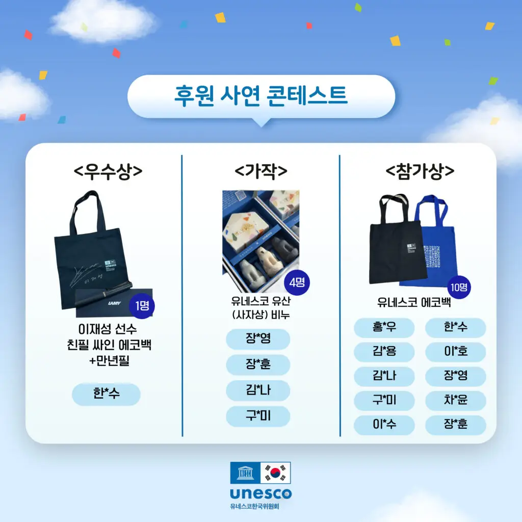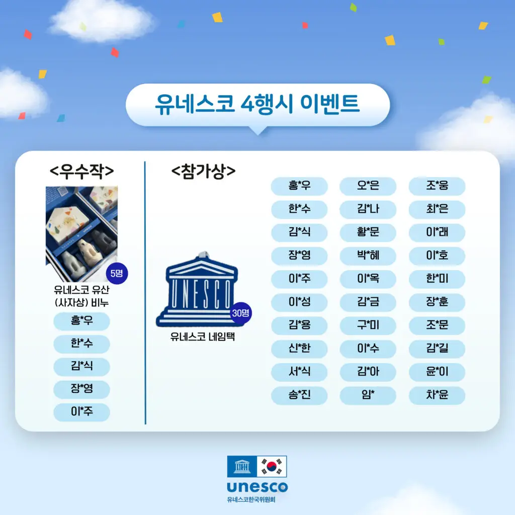 참여해주신 모든 분들과 선정되신 분들께는 제출 시 작성해주신 주소로 유네스코한국위원회의 감사의 마음을 담아 기념품을 보내드릴 예정입니다. ?
