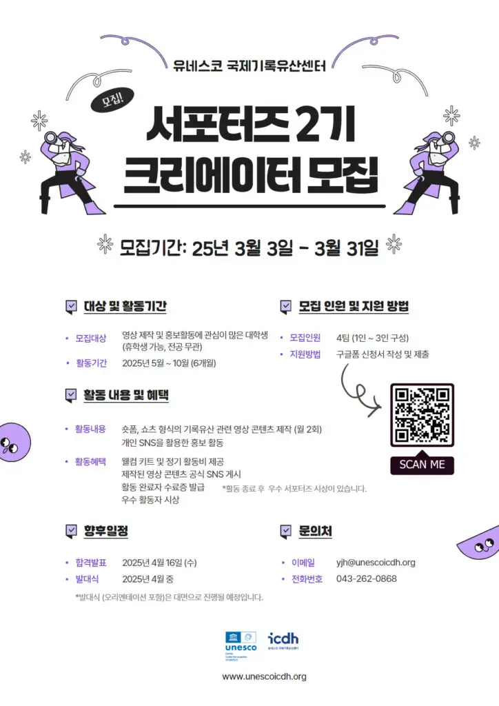 유네스코 국제기록유산센터에서는 센터 홍보 및 기록유산 인식제고를 위한 ‘2025 유네스코 국제기록유산센터 크리에이터 서포터즈 2기’를 모집합니다.