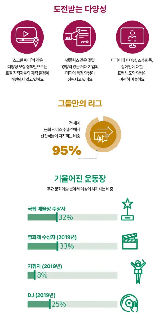 뿐만 아니라 2025년은 문화다양성 협약이 제정된 지 20주년이 되는 해이기도 해요. 우리나라는 문화다양성 협약 정부간위원회의 의장을 역임하기도 했고(2021년), 위원국으로서도 꾸준히 활동을 펼치고 있어서 공정문화의 가치를 알리고 이행하는 데 모범을 보일 수 있는 국가예요. 무엇보다 K-팝과 영화, 드라마가 전 세계 사람들의 뜨거운 사랑을 받고 있는 만큼, 이를 이끌어 가는 주체들에게 더 좋은 환경과 공평한 처우를 제공하는 일은 K-콘텐츠의 앞날에도 좋은 영향을 미칠 거예요. 예술은 원래 배고프고 힘든 거 아니냐고요? 천만의 말씀. 월드스타 레이디 가가(Lady Gaga)가 얼마 전 《뉴욕타임스》와의 인터뷰에서 말했듯, 지금까지는 단지 “행복한 예술가가 위대한 예술을 만들 기회”가 별로 없었을 뿐이에요!