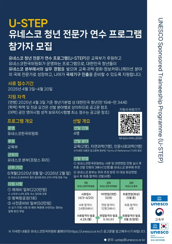 유네스코한국위원회에서 「유네스코 청년 전문가 연수 프로그램(U-STEP)」 참가자를 모집합니다. 대한민국 청년들이 유네스코 본부에서의 실무 경험을 쌓으며 교육·과학·문화·정보커뮤니케이션 분야의 국제 전문가로 성장하고, 나아가 국제기구 진출을 준비할 수 있도록 지원하는 본 프로그램에 청년 여러분의 많은 관심과 적극적인 지원 바랍니다.