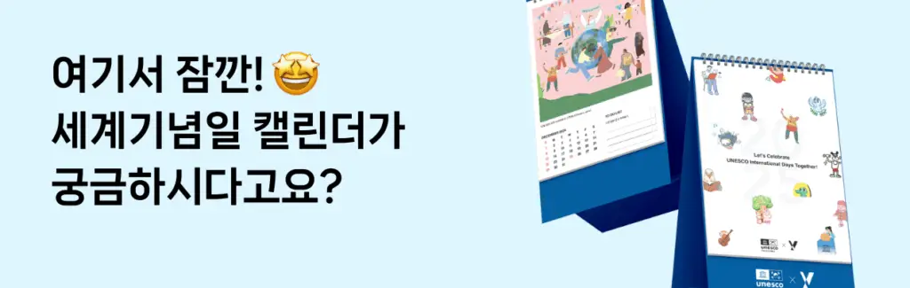 유네스코 세계기념일을 기억하고, 평화롭고 지속가능한 미래를 위한 고민을 나누며 실천해 볼 수 있는 세계기념일 캘린더! 캘린더에 담긴 KT Y 아티스트 13명의 멋진 일러스트를 활용한 PC 및 모바일 배경화면 등의 디지털 굿즈를 아래에서 다운로드 받으실 수 있어요.
