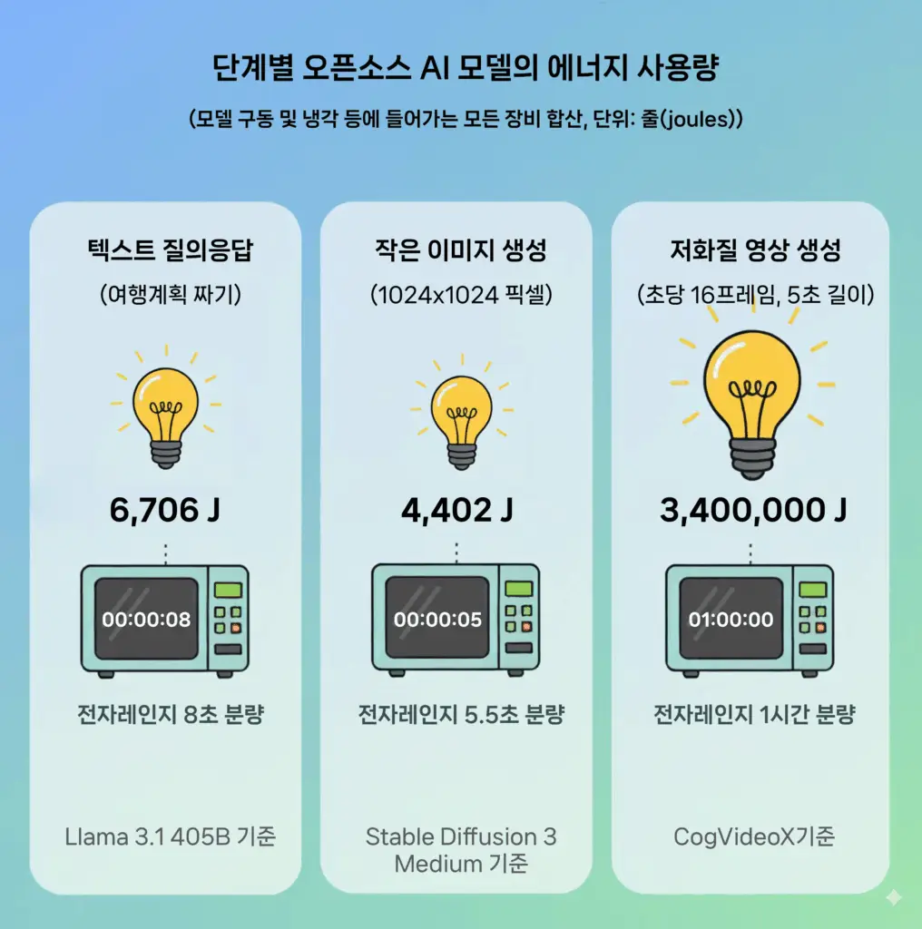 자선 모금 활동을 준비하는 사람이 AI 모델에 질문을 15번 던져 원하는 자료를 얻고, 10번을 시도해 마음에 드는 전단지용 이미지를 만들고, 3번 시도 끝에 5초 짜리 짤막한 홍보 영상을 만들 경우 전체 AI 시스템이 사용한 전력 사용량은 약 2.9kWh(킬로와트시)다.