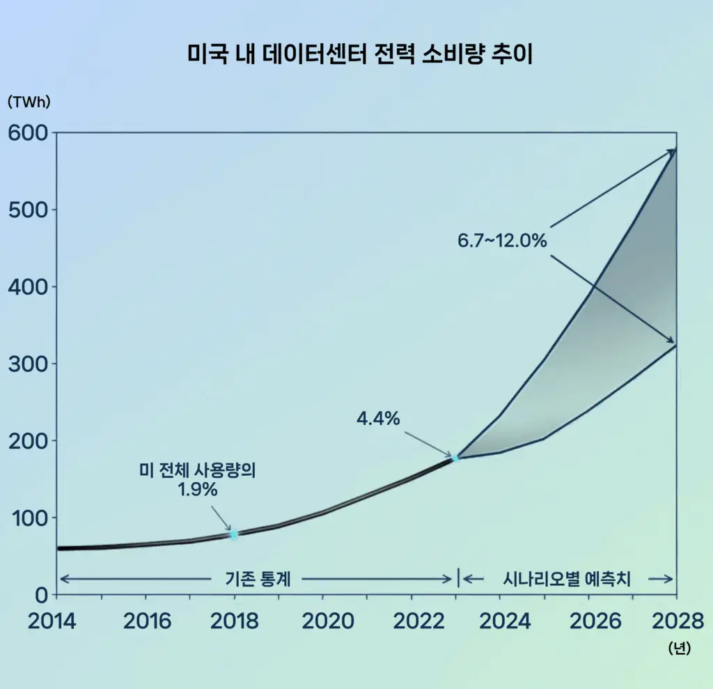 미국의 로런스 버클리 국립연구소(Lawrence Berkeley National Laboratory)에 따르면 2016년까지만 해도 페이스북과 인스타그램, 유튜브 등의 폭발적인 성장에도 불구하고 미국 내 데이터센터의 전체 전력 소비량은 매우 완만한 증가세를 보였습니다. 이 기간에 스트리밍이나 클라우드 서비스 수요를 감당하기 위해 적지 않은 데이터센터가 지어졌음에도 센터 설비의 에너지 효율성이 개선되면서 에너지 소비 증가폭을 억제할 수 있었기 때문입니다. 하지만 기업들이 AI 관련 인프라 투자를 본격적으로 시작한 2017년부터 그래프의 기울기는 점점 가팔라지기 시작해, 2018-2023년 기간 동안 미국 내 데이터센터의 전력 소비량은 76TWh(테라와트시)에서 176TWh로 두 배 이상 증가했습니다. 연구소는 그 원인으로 “에너지 집약적인 고성능 GPU 칩을 중심으로 한 AI 특화 데이터센터가 2017년부터 본격적으로 보급되기 시작해 그 비중이 커지고 있기 때문”이라면서 AI 업계를 콕 집어 언급했습니다. 나아가 보고서는 2024년에 미국의 데이터센터들이 태국 전체 1년 전력 사용량과 맞먹는 약 200TWh의 전력을 사용했으며, 그중 53-76TWh가 AI 전용 서버의 몫이라고 추정했습니다. 더 걱정되는 부분은 지금까지의 증가세가 미래의 증가세를 예측하는 데 별로 도움이 되지 않을지도 모른다는 점입니다. AI기업들은 자신들의 서비스가 그저 ‘재미로 한 번 써볼 만한 것’, ‘기초적인 검색과 요약을 써 보는 것’으로 머무르길 원치 않습니다. 더 복잡하고 다층적인 일을 맡길 수 있는 ‘에이전트’로서의 AI는 이제 막 싹을 틔우기 시작했고, 이미 엄청나게 커진 AI라는 거인의 보폭은 갈수록 넓어질 것이 확실합니다. “지금 우리가 목격하고 있는 AI의 환경 발자국은 역사상 가장 작은 AI의 환경 발자국일 것”이라는 주장(MIT Technology Review)이 결코 과장이 아닌 이유입니다.