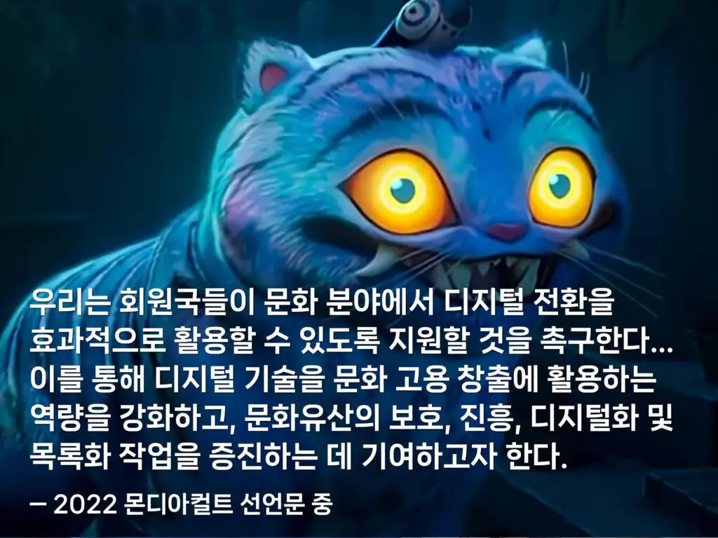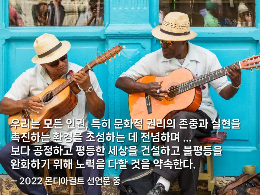 호랑이처럼 강인했던 우리의 문화가 그랬듯, 문화란 인간의 존엄성과 개인적 성취뿐만 아니라 사회적 결속에도 크나큰 힘을 발휘하는 요소입니다. 유네스코가 이번 몬디아컬트에서 ‘문화권(Cultural rights)’을 강조하는 이유입니다. 그런데 왜 그냥 ‘문화’가 아니라 문화‘권’일까요? 여기에는 오늘날 문화의 의미와 역할에 대한 보다 깊은 성찰과 논의의 결과가 담겨 있습니다. 그저 같은 정체성과 전통을 향유하는 것을 넘어, 이제 문화는 인간의 기본권 중 하나로서 윤리적·사회적·경제적 측면에서 민주주의의 핵심 가치가 되었다는 뜻입니다. 이 가치를 더 잘 가꾸어 나가기 위해, 누구나 그 권리를 누릴 수 있도록 하기 위해, 우리는 문화의 여러 측면에서 다양성과 형평성을 증진하고 불평등을 완화시켜줄 방안을 적극적으로 마련해야 합니다. 그 범위는 소수자와 토착 공동체의 문화적 실천과 문화유산을 보존하는 일에서부터 문화 분야 창작자의 권익을 보호하는 일에 이르기까지 정말 넓은데요. 이번 몬디아컬트에 모인 194개 유네스코 회원국 대표들은 이를 위해 필요한 법적 체계와 정책을 적극적으로 마련해 나갈 것도 약속했습니다.