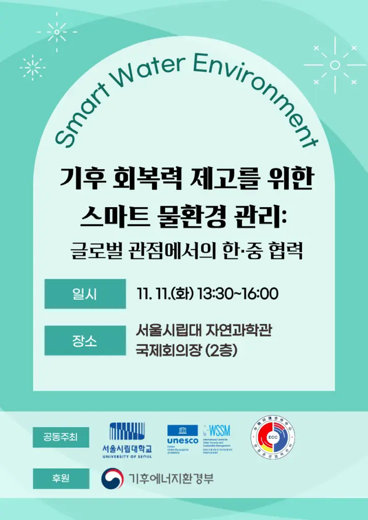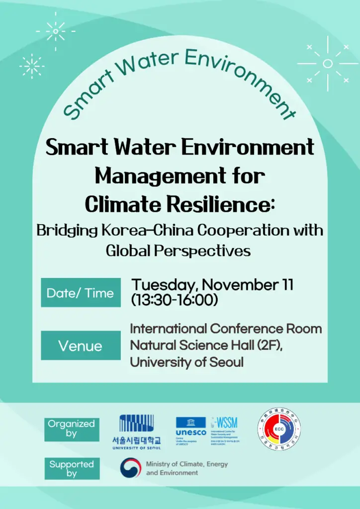We are highly pleased to invite you to the <Smart Water Environment Management for Climate Resilience: Bridging Korea–China Cooperation with Global Perspectives> co-hosted by the UNESCO International Centre for Water Security and Sustainable Management (UNESCO i-WSSM), the Korea–China Environmental Cooperation Center, and the University of Seoul.