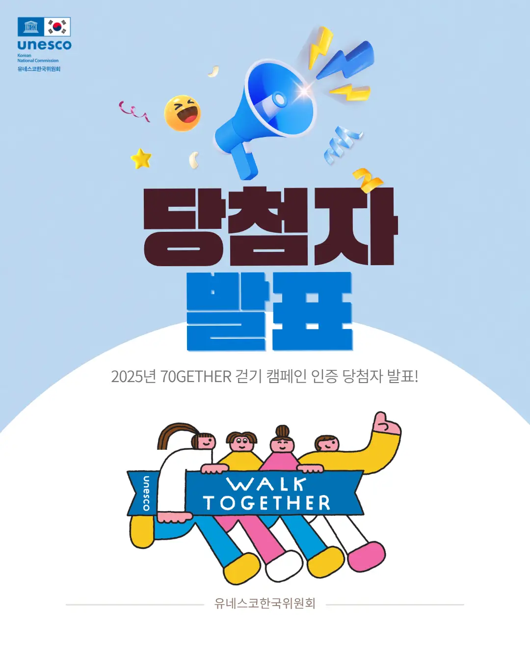 2025년 ‘함께 걷는 길, 함께 지키는 유산 걷기’ 걷기 캠페인에 뜨거운 관심과 참여를 보내주신 여러분께 감사드립니다. 이번 캠페인은 유네스코한국위원회 창립 70주년을 기념하여 진행되고 있는 70GETHER(투게더) 캠페인의 일환으로, 우리의 소중한 유산을 지키기 위한 의미 있는 걸음을 함께 나누는 시간이었습니다.